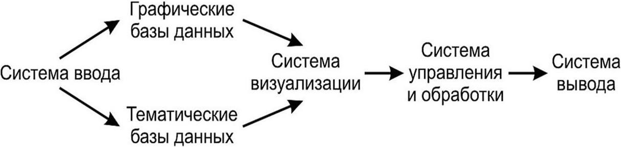 Система ввода представляет собой аппаратные средства (клавиатура, мышь, дигитайзер, сканер, приемник GPS и т. д.) и интерфейс ввода данных. Затем координатные и атрибутивные данные хранятся в соответствующих базах данных и по запросу систем управления и обработки и визуализации используются для осуществления всевозможных (математических, логических, аналитических, статистических) операций. Система вывода позволяет выводить результаты этих операций на монитор, печатать, передавать их через Интернет или сохранять для использования в других программах.