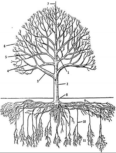Рис. 1. Строение плодового дерева: 1 – ствол; 2 – штамб; 3 – скелетные ветви; 4 – полускелетные ветви; 5 – ветка; 6 – обрастающие веточки; 7 – побег продолжения; 8 – корневая шейка; 9 – горизонтальные корни; 10 – вертикальные корни; 11 – обрастающие корни