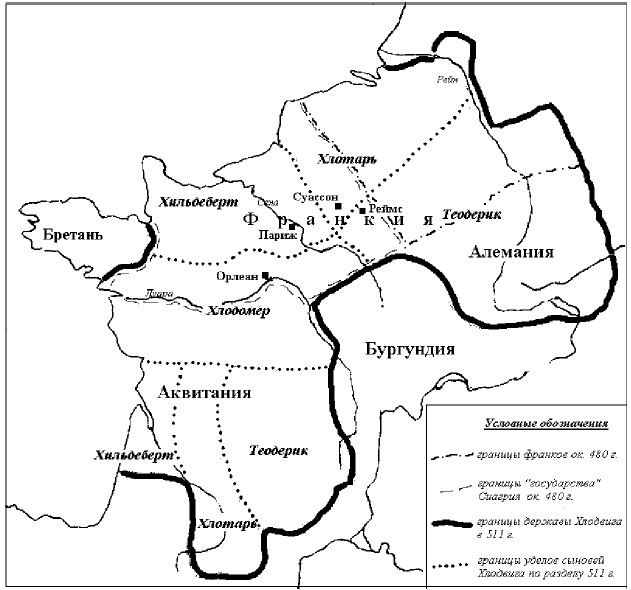 Хронологически первым в ряду франкских разделов стоит раздел 511 г. по завещанию короля Хлодвига, создателя Франкской державы. Каждый из четырех сыновей Хлодвига получил, по сообщению Григория Турского (умер в 593/4 г.), «равную долю» («aequa lance») отцовских владений[88], но при том так, что территориально единым оказался только удел Хлодомера, старшего сына Хлодвига от второго брака с Хродехильдой, тогда как уделы Теодерика, старшего сына Хлодвига от первого брака, а также Хильдеберта и Хлотаря, единоутробных младших братьев Хлодомера, оказались разбиты каждый на две части (см. карту на рис. 3)[89].