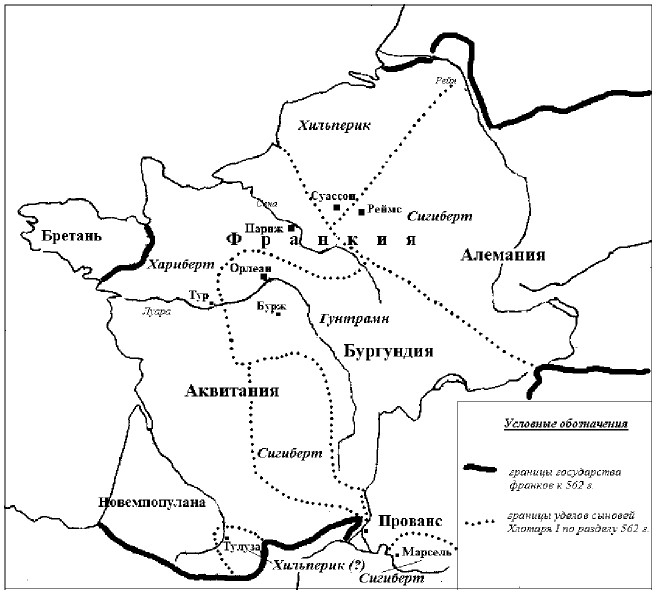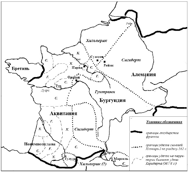 Показательно, что следующий, случившийся в 562 г. раздел между четырьмя сыновьями Хлотаря (умершего в декабре 561 г.), который к 558 г. стал единоличным правителем всего Франкского королевства, применительно к обозначенной центральной области явно следовал тому же принципу, восходя к прецеденту 511 г., – каждый из четырех получил удел с одной из названных выше столиц: даже явно обделенный младший Хильперик, сын Хлотаря от второго брака, получил Суассон (отцовский стол по разделу 511 г.). Трое старших единоутробных братьев, вероятно, стремились избежать чересполосицы, но это удалось только в отношении Хариберта и Гунтрамна, в то время как владения Сигиберта, младшего в этой тройке, помимо главного удела со столицей в Реймсе, включали еще аквитанский и провансальский (с центром в Марселе: остальная часть Прованса с Арлем и Авиньоном принадлежала Гунтрамну) анклавы (см. карту на рис. 4).
