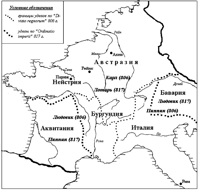 Никаких распоряжений относительно императорского титула или какого бы то ни было иного, пусть только формального, сеньората старшего из братьев, а именно Карла, документ не содержит. Удел Карла отличался, однако, тем, что включал в себя целиком всю прежнюю Франкию в узком смысле в обеих ее половинах – западной (Нейстрия) и восточной (Австразия). Это обстоятельство может показаться принципиальным, так как предыдущий раздел между самим Карлом Великим и его братом Карломаном после смерти их отца короля Пипина III в 768 г. оставлял (если не говорить о деталях) Австразию за Карломаном, а Нейстрию – за Карлом, то есть воспроизводил раздел в предыдущем поколении Каролингов: между старшими сыновьями умершего в 741 г. Карла Мартелла – Карломаном и Пипином (будущим Пипином III)[95]. Однако Карл Великий вовсе не имел идеи неделимости Франкии в узком смысле, как можно было бы подумать; это видно из его распоряжения, что в случае ранней смерти его сына Карла королевство последнего делится между братьями Пипином и Людовиком по границе раздела 768 г. между Карломаном и Карлом[96]. То, что в основе «Размежевания королевств» лежала традиционная идеология corpus fratrum видно еще и по следующему факту: заботу о судьбе папства император возлагал на всех троих сыновей совокупно[97] (хотя Рим и вся Папская область находились в уделе Пипина), причем особо оговаривал, что границы уделов проведены им именно так, а не иначе, еще и с тем, чтобы Карл и Людовик, владея соответствующими перевалами через Альпы, имели удобную возможность при случае прийти на помощь Пипину[98].