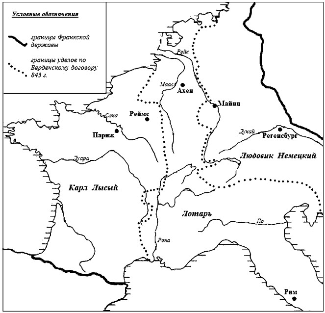Рис. 7. Раздел Франкской державы между сыновьями императора Людовика Благочестивого по Верденскому договору 843 г.