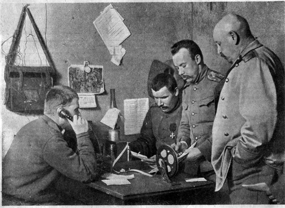 В штабе русского корпуса –важное донесение. Полевой телефон с одновременной передачей по телеграфу главнокомандующему. Начальник дивизии у телефона и телеграфа. Нива, 1915