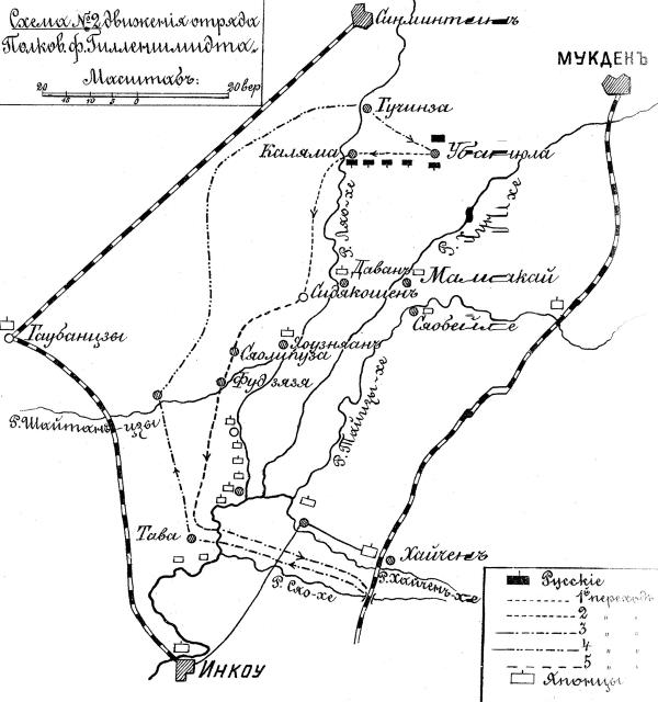 Конный отряд полковника Гилленшмидта был также сформирован лишь для набега – из 4 сотен (2 сотни 1-го Верхнеудинского Забайкальского казачьего полка, 1 сотня Терско-Кубанского и 1 сотня 2-го Дагестанского полков) хоть и разных полков, но объединенных совместной боевой службой в течение нескольких месяцев в составе конного отряда; забайкальские сотни были одного полка, кавказские – одной бригады. Полковник Гилленшмидт был как бы своим для дагестанцев, верхнеудинцы много слышали про него да, случалось, и действовали вместе. Странным было то, что на сформирование сборного летучего отряда были назначены 2 сотни верхнеудинского полка, так как из всего конного отряда забайкальские лошади, хоть и крепкой породы, были наименее пригодны для быстрых переходов (к тому же надорваны тяжелой службой с первого дня кампании – начиная с похода в Корею; правда, в забайкальские сотни 5—6-рядного состава было добавлено по 2–3 ряда от других сотен полка – на хороших лошадях).