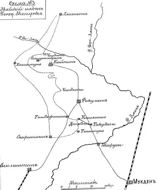 Во время майского набега за Факумынь на отряд Мищенко была возложена задача8 «перейти в тыл западной группы японских армий и задержать переход их в наступление, истребляя склады и транспорты и портя пути подвоза, в том числе особенно железную дорогу». Синминтинская железная дорога считалась нейтральной, и запрещалось ее разрушение. «Задержка наступления японцев была важна, дабы иметь время усилиться подходящими укомплектованиями, прибывающими в период с 5 по 20 мая»9.