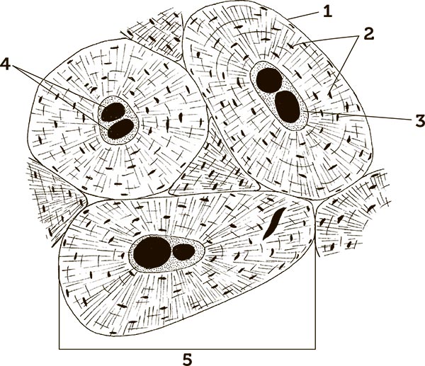 Строение костной ткани: 1 – твердое вещество (минеральные соли и органические волокна); 2 – остеоциты (живые клетки кости); 3 – гаверсовы каналы; 4 – кровеносные сосуды; 5 – остеон – структурно-функциональная единица костной ткани.