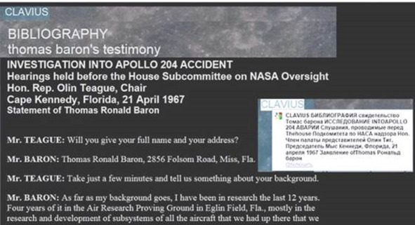 Далее читаем там же: «Бэрон написал два доклада. Первый 55 – страничный доклад был представлен чиновникам НАСА в конце 1966 года, вскрывая нарушения, которые он наблюдал во время работы на космодроме. Менеджеры изготовителя решили, что некоторые замечания Бэрона правильны, но в остальном доклад неприемлем. После утечки доклада в прессу, он был уволен. Бэрон начал готовить основательный доклад. После пожара «Аполлона – 1» он представил этот доклад на 500 страниц в комитеты Конгресса, расследовавшие этот инцидент». Итак, в конце 1966 года инспектору был послан вполне ясный сигнал – «За критику «Аполлона» Вы уволены! Делайте выводы!». Вряд ли он знал, что вместо полётов на Луну готовится глобальный обман. Скорее всего, Бэрон искренне беспокоился за астронавтов, которые сядут в такой корабль. А по сути дела, он тоже «вешал лимон» на «Аполлон». 21 апреля 1967 года, вооружившись вторым докладом, он вновь вызвал руководство НАСА на явно неравный спор об «Аполлоне». [4] Автор книги показывает наличие документов, ссылаясь на американского пропагандиста «Джея Виндли». Указанный инспектор имел отношение к программе «Аполлон»: «За своё правдоискательство инспектор Бэрон уже получил увольнение с работы. Ближе к развязке этой истории Т. Бэрон и его жена стали получать новые предупреждения. Уже анонимно и по телефону. «Томас Рональд Бэрон заявил перед Конгрессом, что плачевное состояние аппарата не позволило бы достичь Луны. Он представил отчёт на 500 листах. Высказав своё мнение, Бэрон превратился в живую мишень. Корреспондент: «Вы чувствуете давление со стороны НАСА?». Бэрон: «Нет! Хотя сразу после этого инцидента, мы с женой получали звонки с угрозами, но сейчас всё тихо». Бэрон успокоился, а зря». [4] Ниже представлено изображение документа.