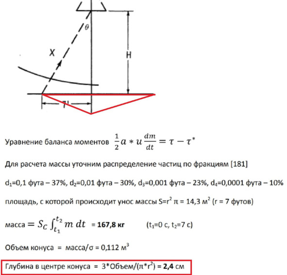 Ссылка 147 в настоящее время не открывается. Защитник НАСА почему-то решил, что след, которые образуется на рыхлой поверхности, представляет собой конус! Но это утверждение не соответствует действительности, о чем не знал сам автор опуса, и, видимо, не знали сказочники НАСА. След от работы ЖРД на рыхлом грунте представляет собой полусферу. Рыхлая почва сдвигается давлением газа не только вниз, но и в разные стороны. При этом образуется возвышение по краям полусферы. Таким образом, если рыхлый грунт находится на глубине более 7 футов, глубина полусферического кратера будет составлять эти самые 7 футов или 2,13 метра. Американский пропагандист полагает, что образование конуса на рыхлой почве не приводил к появлению возвышения почвы по краям круга-основания конуса. Защитник НАСА не учел сдвиг почвы в сторону от центра и образование возвышенности по краям круга с радиусом 7 футов. Это приводит к увеличению глубины кратера с 2-х см до 30—40 см, если глубина рыхлого грунта это позволяет.
