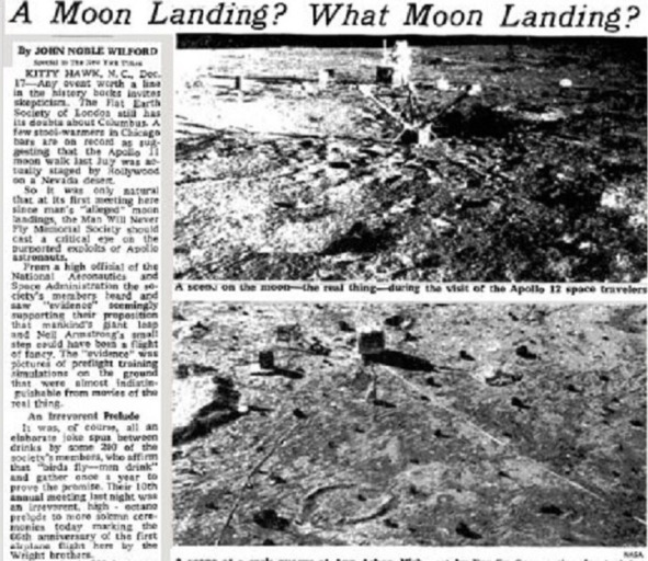 Самая первая публикация с информацией о фальсификации «лунных полетов» появилась в газете «Нью-Йорк Таймс». Статья «A Moon Landing? What Moon Landing?» была опубликована 18 декабря 1969 года. Автор публикации: Джон Нобл Уилфордс. В ней, якобы, говорилось, что, со слов анонимного осведомителя из НАСА, все фотографии и видео материалы лунных прогулок экипажа «Аполлон-11» были созданы заранее. Эти кадры, по сведению автора статьи, были не более, чем искусственным монтажом, что высадку на Луну сняли на Земле. Именно это сообщение американской газеты: «Высадка На Луну? Какая Высадка На Луну?», породило недоверие в американском обществе к программе «Аполлон». В статье была размещена фотография местности, в пустыне Невада, которая внешне напоминала лунную поверхность. Официальные власти США постарались забыть про появление такой публикации. Само появление статьи в «Нью-Йорк Таймс» хотели вычеркнуть из истории. Необходимо отметить факт, что автор указанной статьи не имел злого умысла разоблачать фальсификаторов.