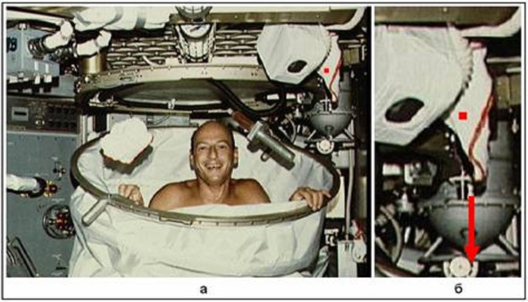 Автор книги обосновано считает, что фотографии, сделанные клоунами НАСА можно сделать на Земле. Попов А. И. полагает, что на этих снимках имеются признаки наличия земной гравитации. Попов А. И.: «Илл.3. Тряпочка провисла под действием силы тяжести. (Душ в „Скайлэбе“). Но ведь точно так же эта сцена выглядела бы и на Земле. Сомнение усиливает отмеченная красной меткой тряпочка, которая видна в правом верхнем углу снимка. Она обвисла строго по вертикали, как будто на неё действует сила веса. А как эта сила „пробралась“ на орбитальную станцию, где должна царить невесомость?».