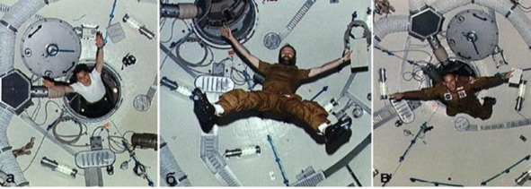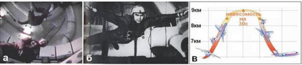 Просмотр клипов на тему невесомости в «Скайлэбе» показывает, все эпизоды о невесомости, якобы снятые в «Скайлэбе», очень кратковременны. Их средняя продолжительность – 10 секунд. А когда встречаются более длительные клипы, то они состоят из набора отдельных коротких сцен. Зачем же так спешили астронавты-кинооператоры, если в настоящей космической станции невесомость – «вещь» постоянная, и при её съёмках спешить некуда. Возникает предположение о том, что все эти короткие клипы сняты не в космосе, а в известном всем космонавтам самолёте – тренажёре (илл. 6в). Для достижения в салоне кратковременного состояния невесомости такой самолёт разгоняется вверх и, продолжая двигаться по инерции, делает «горку», а затем начинает падать вниз. При такой траектории в салоне самолёта наступает состояние невесомости.