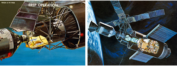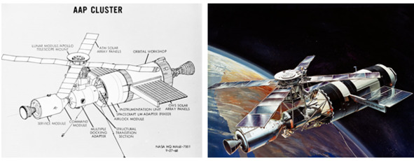 Это хорошо демонстрируют картины художников НАСА. Изображение слева: s69—34498 «Обозначенная художником концепция прикладной программы «Apollo (AAP) Skylab Cluster». [2] Картинка справа: S72—30705 «Концепция художника Мартина Мариетты о космической станции Skylab на орбите Земли. Кластер состоит из командного / сервисного модуля Apollo, орбитальной мастерской, телескопического крепления Apollo (ATM), адаптера для нескольких стыковочных узлов и модуля шлюзовой шлюза. Обратите внимание на массивы панелей солнечных батарей, которые превращают солнечный свет в электроэнергию для космической станции». [3]