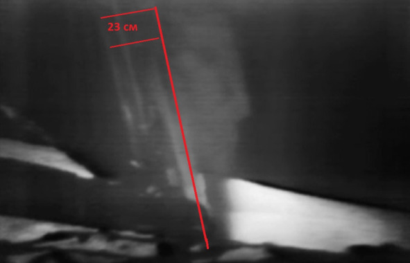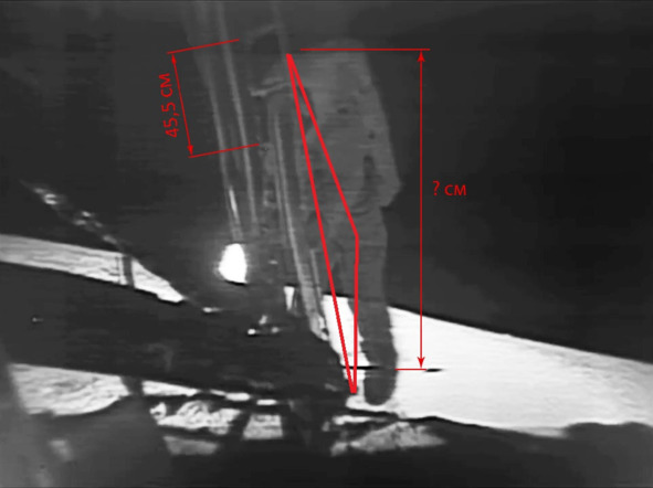 Подбирать карлика, шить на него костюм, посвящать лишних людей в суть события – это все совершенно лишние затраты. Никаких предпосылок к такому решению организации фальсификации не было. Леонид Коновалов допустил серьезную ошибку, когда определял рост лунного актера из «трансляции» шоу «А-11». Он основал свой вывод на единичном кадре, в котором актер выпятил свой зад в сторону от телекамеры (на самом деле кинокамеры). При такой позе Проекция на кадре показывает уменьшение роста персонажа. Леонид неправильно определял величину роста актера при помощи вертикальной к горизонту линии. Здесь рост нужно определять по линии, которая имеет небольшой угол наклона к горизонту и совпадает с «линией» лестницы. Если посмотреть другие кадры, то можно обнаружить изображение актера, рост которого отличается от роста лилипута и находится в районе 180 см. Эталоном измерения можно взять величину проема между перекладинами лестницы. Хотя, если честно, это ненадежная величина, и она могла быть другой.