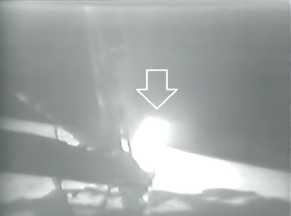 Актер на фоне белой почвы как бы «исчезает». Хорошо заметно, что участок за «Лунным модулем» освещен контрастным круглым световым «бликом», что выдает наличие в киностудии большого прожектора. Данный эффект не является следствием оптических дефектов, связанных с технологиями ТВ вещания того времени. Иначе бы ореол образовался на передней части кадра. Но этого ничего нет. На кадрах трансляции отлично продемонстрировано, что цвет скафандра полностью совпадает с цветом грунта, расположенного сразу после «ЛМ». Наверное, фальсификаторы заметили свои ошибки, сделанные в начале фильма, и принялись лихорадочно их исправлять. От процесса новой съемки они отказались. Возможно, что они просто торопились, и у них было мало времени. Но возможно, что сказочники НАСА и группа Кубрика решили, что и так сойдет и никто ничего не заметит. Кубрик не отличался аккуратностью. В его других фильмах часто встречаются «кино ляпы».