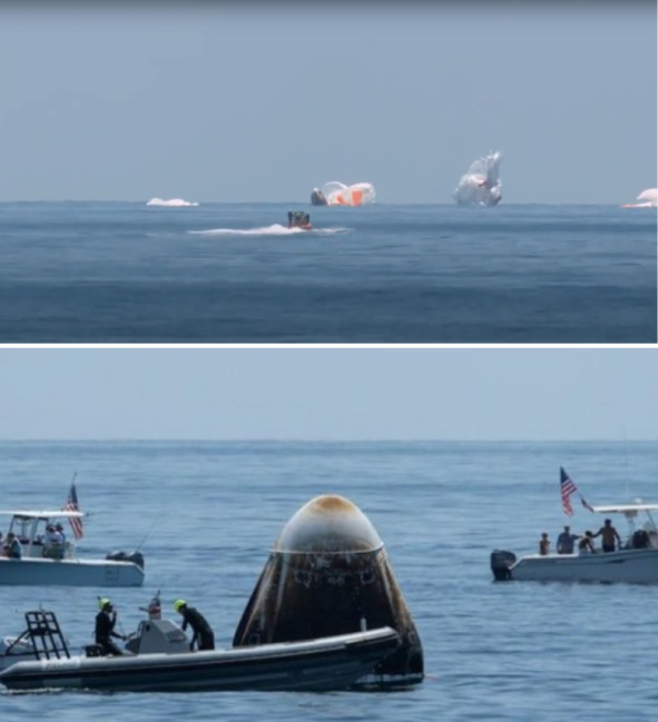 Наконец, в августе 2020 года появилось еще одно подтверждение версии о фальсификации НАСА указанных «полетов». На кадрах видео фильма об этом событии, на фотографиях, сделанных после приводнения, хорошо видно, что боковые поверхности капсулы «Драгон» обгорели полосами даже в районе минимального аэродинамического нагрева. В районе максимального аэродинамического нагрева обгорание и покрытие копотью носит более заметно