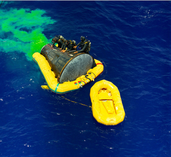 Фотография НАСА, подпись: «S65—33490 (7 июня 1965 г.) – Группа водолазов ВМС США участвует в восстановлении космического корабля Gemini-Titan 4 (GT-4). USS Wasp был основным спасательным кораблем для миссии Gemini-4». На белой полоске, на поверхности аппарата не видно никакой копоти.