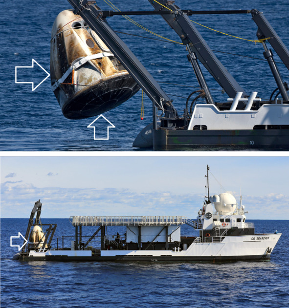 Наконец, в августе 2020 года появилось еще одно подтверждение версии о фальсификации НАСА указанных «полетов». На кадрах видео фильма об этом событии, на фотографиях, сделанных после приводнения, хорошо видно, что боковые поверхности капсулы «Драгон» обгорели полосами даже в районе минимального аэродинамического нагрева. В районе максимального аэродинамического нагрева обгорание и покрытие копотью носит более заметно