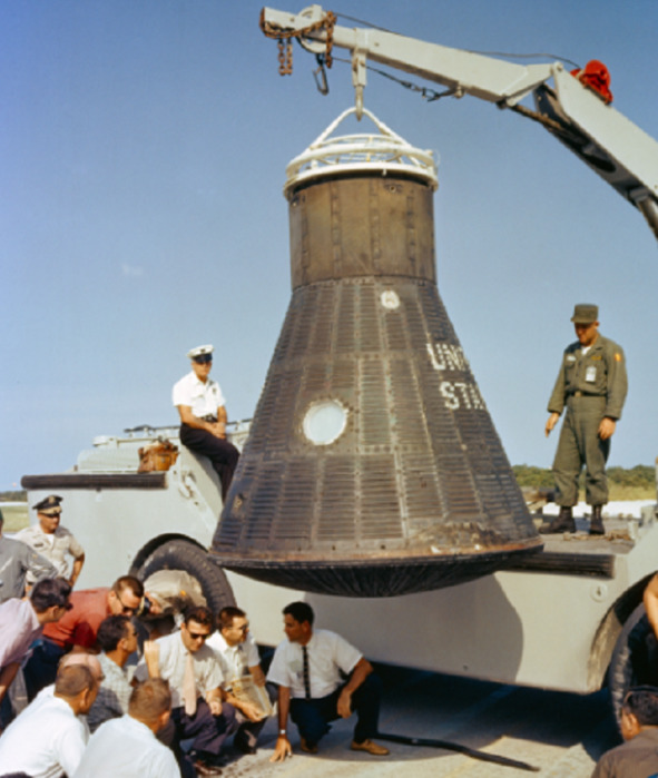 Фотография НАСА, подпись: «S64—14861 (1962 г.) – Персонал Министерства обороны (DOD) по восстановлению и технические специалисты по космическим кораблям из НАСА и McDonnell Aircraft Corp. инспектируют космический корабль „Меркурий“ астронавта Джона Гленна „Дружба 7“ после его возвращения на мыс Канаверал после восстановления в Атлантическом океане». Белая надпись даже не потемнела.