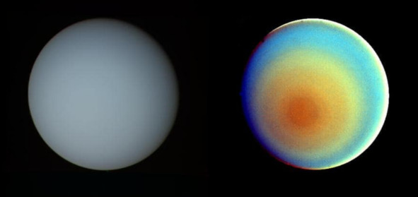 Подпись к кадру: «Уpaн в иcтиннoм цвeтe (cлeвa) и лoжнoм (cпpaвa). Кадры добыты камерой Boяджepa-2 в 1986 год». [3]
