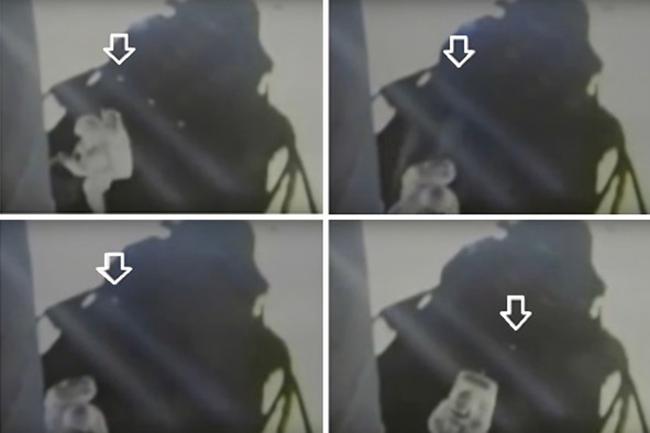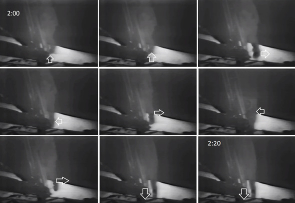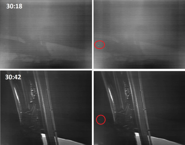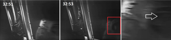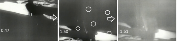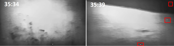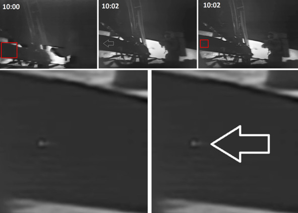 Смена обзора с кадра «34:47» обнаруживает наличие еще двух светлых пятна круглой формы. При резком перемещении эти капли не летели с линзы и остались на месте, это будет видно далее. По всей видимости, они замерзли и поэтому прочно держались на стекле. Эти же капли воды на линзе телекамеры (кинокамеры) проявляются на кадре «34:59». Место их расположения указано кружками и стрелками. Кадр «35:02» показывает наличие трех капель воды. Кадр «35:06» фиксирует две капли.