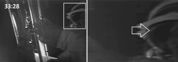 Почему исчезло изображение одной из капель? Когда направление освещения на выпуклой линзе освещает каплю, она становиться видимой, или невидимой, в зависимости от направления освещения. Тоже самое происходит с каплей воды, которая замерзла и стлала льдом с хорошей прозрачностью. Следующие кадры «35:34» и «35:39» содержат изображения трех капель воды на внешней стороне линзы. Они отмечены на кадре «35:39» красными квадратами.