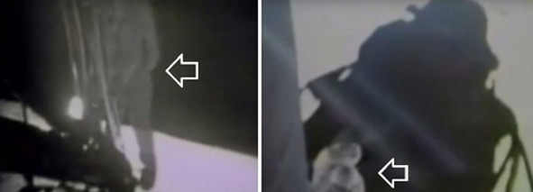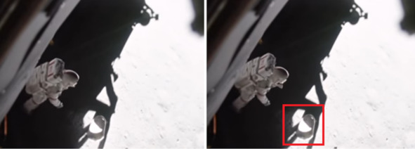 Вторая телекамера была включена в кабине Олдрином. Обращает внимание аномальный факт. На кадрах хроники «лунной трансляции» с телекамеры около лестницы скафандр «космонавта» не подсвечен «лунным грунтом». Поэтому фигурка «космонавта» выглядит темной, на кадре слева. Но на кадре справа фигурка светлая. Её дополнительно осветили.