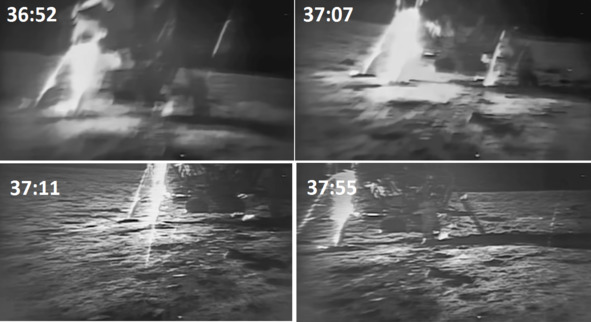 Кадры из фильма «Высадка на Луну. Аполлон-11». Реальные кадры», были получены ЦУП в Хьюстоне и выведены на большой экран. Кадр «0:41» и далее показывает, как кто-то сменил направление съемки телекамеры, которая, согласно сказкам НАСА, находилась слева от лестницы «ЛМ». Началась сразу же «трансляция» лунной прогулки Нейла. Олдрин, по версии американских сказочников, находился в «ЛМ» и не мог изменить направление съемки телекамеры. Системы удаленного управления этой телекамерой американские фальсификаторы не декларировали. Включить телекамеру и поменять направление съемки Нейл не мог, он в этот момент спускался по лестнице. Второе изменение направление съемки произошло на кадре «1:51». [4]