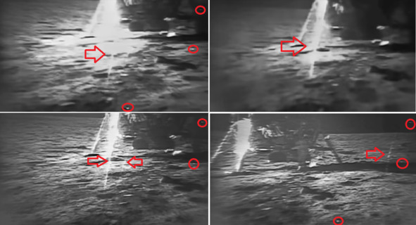 Нейл (или его дублер) в этот момент, левой рукой держался за лестницу, правая рука не могла изменить направление съемки с помощью приводов или веревки. На кадрах (1:50) начали проявляться светлые точки, они отмечены окружностями. Для того чтобы признать эти съемки фальшивками, не нужно было никаких перехватов кадра «Восход Земли», перехвата «переговоров». Достаточно было посмотреть внимательно, лучше в записи, «лунную трансляцию», кадры которой получали только американские фальсификаторы. С первых минут этой «трансляции», оператор телекамеры, который находился на «Луне» США выдал себя! Только он мог изменить два раза направление съемки телекамеры, изменить увеличение и другие параметры. Если смотреть дальше «трансляцию» внимательно, то в ней обнаруживается еще много интересных и забавных аномалий! В роликах НАСА признаки фальсификации были на всех кадрах.