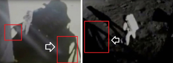 На кадре телевизионной съемки, сделанной из кабины, сверху, фигурка «космонавта» выглядит в тени почти белой. Это могло произойти только благодаря дополнительному источнику света с теневой стороны «ЛМ». Свет делает костюм лунного актера в тени хорошо видимым и белым. На кадре внизу слева фигурка «космонавта» в тени. На кадре справа, фигурка «космонавта», освещенного «Солнцем». При этом, на втором кадре тени выглядят непроницаемо черными. Они не подсвечены. Следующие кадры, ниже, были отмечены американским скептиком Кольер в фильме «Was it only a paper moon?» [2] Он заметил в этой «лунной трансляции» изменение направления освещения солнечного света. Такого не могло быть на реальной Луне.