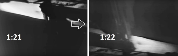 На кадре «37:11» оказывается что «стержень» был не один. Теперь хорошо видно, что дополнительно «стержней» было еще два. На кадре «37:55» эти «стержни» стали невидимыми и исчезли. Но появился третий «стержень», крайний справа. «Стержни» это мелкие капли воды, которые остались на внешней стороне линзы оставили след в виде короткого отрезка. Их было как минимум три штуки. Появление и исчезновение изображения отрезков из мелких капель воды в кадре определяется направлением освещения капелек воды на поверхности линзы. Если в киностудии было прохладно, то капельки воды могли замерзнуть и образовать отрезки маленьких льдинок. Они, как и капелька воды, в зависимости от направления их освещения могут становиться то видимыми, то невидимыми.