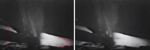 Стрелками и кружками показаны расположения треков мелких капель воды или инея и крупных капель воды, которые фигурировали на кадрах «35:34», «35:39». Последний кадр не стал окончательным в стабильной сцене, которую и наблюдали люди во многих странах мира, на протяжении длительного времени «лунной трансляции». Передвижение телекамеры с большой скоростью образовывало вокруг более крупных капель воды движение воздуха. Это движение начинало разбивать крупную каплю воды на ряд мелких капель. Поэтому произошло образование новых «стержней» в этот момент времени резкого передвижения переносной телекамеры.