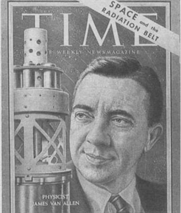 Джеймс Ван Аллен с прибором спутника «Эксплорер-1», с помощью которого он обнаружил первые признаки существования радиационных поясов Земли (обложка журнала «Тайм» от 4 мая 1959 г.) Все оказалось намного проще. Первыми, кто зарегистрировал наличие радиационных поясов Земли, были не американцы: «С 3 ноября 1957 г. на втором советском искусственном спутнике Земли (ИСЗ), с апогеем орбиты – 1671 км и углом ее наклона i=69,3°, гейгеровскими счетчиками, установленными группой С. Н. Вернова, регистрировался хорошо известный рост с широтой потока космических лучей. Неожиданно на его фоне был зарегистрирован быстрый всплеск интенсивности заряженных частиц. Хотя тогда авторы эксперимента объяснили его приходом к Земле энергичных частиц от Солнца, сейчас мы понимаем, что это был первый в истории факт регистрации прибором спутника частиц радиационных поясов. Однако тогда на основании этого единичного факта такой вывод сделать не удалось. Сигналы этого прибора с апогейных высот в южном полушарии принимались австралийскими специалистами. Если бы им удалось сразу же расшифровать свои записи, то открытие радиационных поясов могло произойти еще в 1957 г. Этому помешала секретность кодировки сигналов советского спутника». [1]