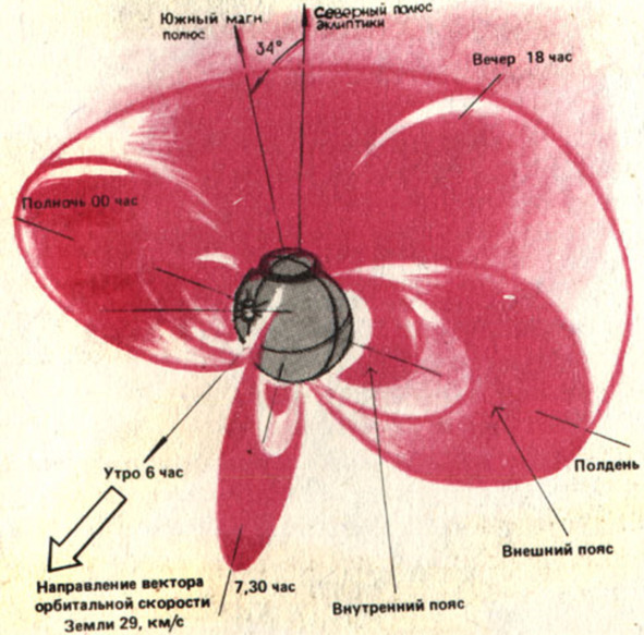 Число протонов с этими энергиями значительно уменьшается при росте расстояния от Земли и при его сокращении. Из-за своей огромной проникающей способности протоны представляют значительную опасность для экипажей космических кораблей, достигающих значительных высот. Энергия электронов внутреннего пояса, как правило, бывает порядка 100 кэВ, а максимальная их концентрация наблюдается на высотах около 3400 км от земной поверхности. Границы внешнего радиационного пояса принято считать находящимися на расстояниях 19 тыс. и 45 тыс. км. от Земли. Здесь преобладают протоны с энергиями до нескольких сотен кэВ и электроны с энергиями от 40 до 100 кэВ». [1] Это признанный миф США.