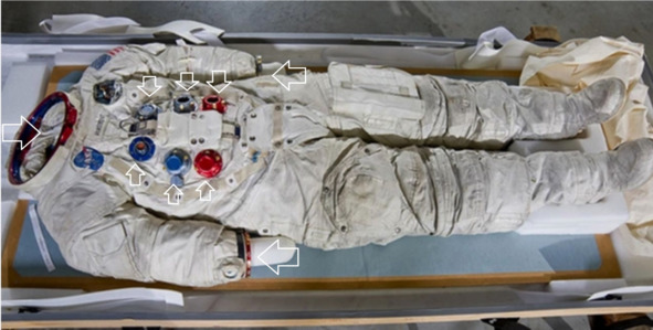 Указателями указаны «отверстия» в «скафандре» Нейла: 6 штук на груди, одно большое отверстия для гермошлема, два отверстия для рук и видимо два отверстия для ног. Подобное количество проемов в «скафандре» не улучшает ситуацию с безопасностью его использования. Ситуация очевидная, чем больше отверстий в таком костюме, тем больше вероятность нарушения его герметичности. Но самое забавное в этой ситуации то, что утверждения Ральфа Рене остаются очень актуальными. Даже про секретность американского скафандра. «Скафандр» Нейла Армстронга, ранее, не выставляли на общее обозрение: «Смитсоновский институт, американский научно-исследовательский и образовательный комплекс, запустил первую в своей истории краудфандинговую кампанию на сайте Kickstarter. Ее цель – собрать 500 тысяч долларов на то, чтобы сохранить и оцифровать знаменитый скафандр, в котором Нил Армстронг 46 лет назад совершил высадку на Луну.» Сейчас мы даже не можем выставить его на обозрение, потому что он содержится в специальном хранилище, которое оберегает его от разрушения, – поясняет Фил Плейт, известный астроном и блогер, – точно так же, как и все остальные скафандры из экспозиции «Аполлон-11». Но теперь существуют технологии, которые позволят восстановить их, оцифровать и представить в музее, чтобы каждый мог увидеть их». После того как над скафандром будут проведены все необходимые работы, он станет основой для новой выставки «Пункт назначения: Луна», которая откроется в 2020 году (в 2019-м исполнится 50 лет с того знаменательного полета). Экспозиция будет располагаться в Национальном музее авиации и космонавтики». [3]