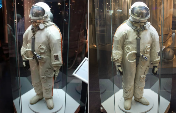 Описание фотографии: «Скафандр „Беркут“ предназначался для выхода в космос. Использовался Беляевым и Леоновым в 1965 году. Масса скафандра без ранца 20 кг». [5] Для справки: «Кираса – элемент исторического нательного защитного снаряжения, состоящий из грудной и спинной пластин, изогнутых в соответствии с анатомической формой груди и спины человека». Настораживает, что на гермошлеме нет надписи СССР. Такая надпись фигурировала в кадрах официальной трансляции о выходе человека в открытый космос. Кроме этого, на правой руке в космосе имеется окантовка шеврона коричневого цвета. В музее такого «узора» на правой руке нет. Шланги, идущие к ранцу, расположены в рассматриваемых случаях по-разному. Ниже представлен кадр из знаменитой трансляции выхода в космос. Изображение хорошего качества стало поводом для сомнений в реальности выхода в космос космонавта Леонова. В этом случае, можно предположить, что, костюм из музея дубликат, или съемка с хорошими кадрами делалась в студии. Такая практика существовала. Это не секрет. Пример: фильм про Гагарина.