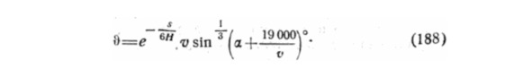 Как видно из списка параметров и обозначений, приведенных автором в начале главы, эту величину он упорно называет температурой тела и пытается вывести формулу определения указанной величины, в зависимости от угла вхождения метеорита в атмосферу: «Так как в действительности мы можем сказать лишь кое-что о наблюдаемых излучениях, а об истинной температуре метеоритных тел мы не делали никаких предположений, то следует заключить, что & есть эффективная температура, т.е. та температура, которую должно было бы иметь абсолютно черное тело, светящееся с яркостью; метеорита. Но эта температура и нужна, так как мы хотим лишь знать, какое количества тепла излучается или, вернее, какое количество тепла было-приобретено. Температура неохлажденной поверхности, расположенной под углом α к воздушному потоку, при скоростях 5000 – 15000 м/сек может быть определена по формуле: θ