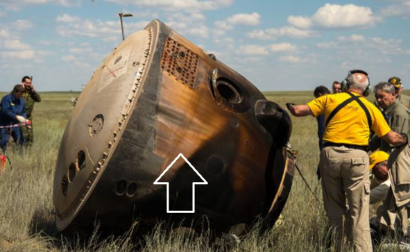 Полосы обгорания на боковой поверхности видны на американской капсуле «Драгон» после приводнения. [7] Фотография выполнена, якобы, 15 марта 2016 г. Сведения о параметрах защиты от аэродинамического нагрева: «Теплоизоляционный щит герметичного отсека абляционный, его испарение уносит с собой тепловую энергию. Негерметичный отсек от стыковывается перед завершением миссии и сгорает в атмосфере». [8] Американские чудотворцы не предусматривают абляционную защиту на боковой поверхности такой капсулы. В Будущем это обернется большими неприятностями. В отличие от американской капсулы, проверенный космический корабль «Союз» имеет абляционную защиту на боковой поверхности. Этот проверенный способ защиты от аэродинамического нагрева уже не раз спасал от гибели космонавтов, которые находились в этом аппарате при спуске. Но, как видно на фотографии, такие же полосы обгорания присутствуют и на боковой стороне КА «Союз». [9] Ниже, снимок капсулы после приземления: Полосы обгорания.