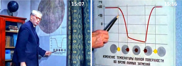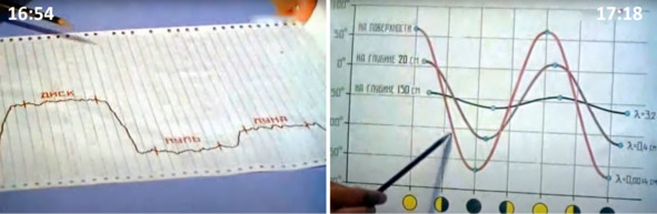 В. С. Троицкий: «Запись выглядит вот так (кадр 16:54) Это излучение диска, это излучение неба (нуль), это излучение Луны. Путем сравнения записей определяется температура лунного грунта. Оказалось, что с глубиной залегания температура уменьшается (кадр 17:18) На поверхности Луны в течении лунного месяца температура меняется очень сильно. На глубине 20 см температура изменяется меньше. А на глубине 150 см температура практически остается постоянной. Если на поверхности максимальная температура наступает с полнолунием, то на глубине на несколько дней позднее. Всё это говорит об очень низкой теплопроводности лунного грунта в его толще. По химическому составу он схож с земными породами». [3]