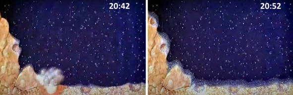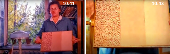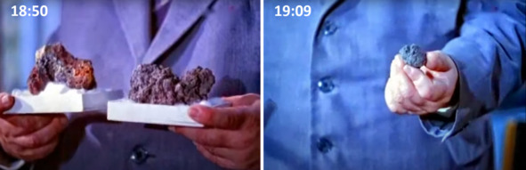 Оказалось, что лунная поверхность ведет себя как этот образец: Кадр 11:50. Лунная поверхность сильно изрыта и ноздреватая. Поверхность же американской «Луны» выглядит слегка шероховатой, покрытой мелкозернистым песком серого цвета. Американская «лунная поверхность» местами покрыта мелкой пылью, что делает такую поверхность, похожей на образец сотрудницы харьковской обсерватории Федорец В. А. справа, с ровным покрытием с малой шероховатостью. Геологам, которые знают геологию, хорошо известно, что большие отложения песка образуются в результате интенсивной водной эрозии, это места прохождения потоков воды, рек и ручьев. На реальной Луне должен быть другой грунт. И это не песок!