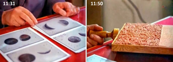 На кадре 11:03 освещенность всех трех образцов, которые окрашены в один и тот же цвет, выглядит одинаково. Потом происходит поворот учебного пособия, когда меняется освещенность лотка. На кадре 11:18 хорошо наблюдается различие освещенности трех образцов. Гладкий образец выглядит более светлым, чем образцы шероховатый и ноздреватый.