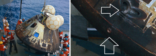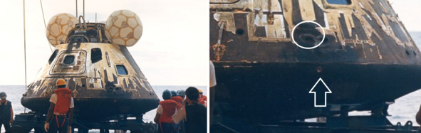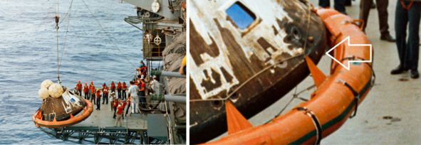 Фотография НАСА s70—35632 показывает КМ «Аполлон-13» после приводнения. Один из признаков фальсификации белая точка на торце теплового экрана и след обжига необычной формы на боковой поверхности. Эти аномальные проявления отмечены белыми стрелками на увеличенном фрагменте кадра.