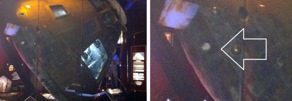 В музее этот предательский кружочек сохранился. Командный модуль «Аполлона-13», «Одиссея», выставлен в Космическом центре штата Канзас. [23] Указанная аномальная метка отмечена на увеличенном фрагменте снимка белой стрелкой. После аэродинамического нагрева такого кружка в этом месте быть не могло. Согласно мифологии НАСА температура в этом районе, на поверхности модуля достигала 2000 градусов в течение промежутка времени более двух минут. Этого должно было хватить, чтобы такое белое пятно обгорело, оплавилось и покрылось слоем нагара и копоти.