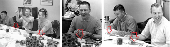 Собственно такое признание равнозначно написанию явки с повинной. С такими параметрами полета американская ракета «Сатурн-5» не могла вывести головную часть ракеты на нужную орбиту Земли. Вывод бесспорный и очевидный. Но не для американских сказочников, которые решили, каким-то волшебным способом, продлить работу остальных четырех ЖРД на 34 секунды. Потом эти волшебники заставили отработать третью на 9 секунд больше, чем это было предусмотрено. Все стало в порядке, проблема была решена. Для волшебников НАСА не было никаких препятствий. В их виртуальном мире такие трудности решались легко и просто. День, когда был назначен старт, начинался, как обычно, с завтрака, в лучших традициях программ «Меркурий» и «Джемини». На завтрак «космонавтам» подали большие куски жареного мяса, поджаренный хлеб, много кофе и других мочегонных напитков. «Космонавты» съели все до последнего кусочка. Стрелками на фотографиях НАСА указаны изображения опустошенных тарелок и пищи, которая там была. Никаких перетертых и диетических блюд на столе не было. «Космонавты» поедали в больших количествах не диетическую еду.