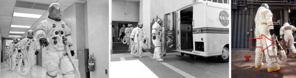 Речи даже не шло о том, что перед тяжёлым полетом, с большими перегрузками, надо питаться умеренно, а еще лучше сделать очистительную клизму. На лицах «космонавтов» нет и тени сомнения в успешности «полета». Они радостные и довольные жизнью и предстоящим «путешествием». «Лунные прогулки» этих космонавтов были сняты заранее. Это если верить интервью Тома Патрика Мюррея у Стенли Кубрика, фантастический, художественный фильм «Экипаж „Аполлон-13“ на Луне» снял сам Кубрик. [3] Поводов для волнения не было. Схема обмана была проверена и не давала сбоя. Простодушные граждане многих стран поверили в «достижения» США. Жизнь удалась! Началось движение «космонавтов» к автобусу и потом выход из него сопровождался заменой ранцев у двух «космонавтов». Сначала шланги были белыми, после автобуса космонавты держали ранцы с темными шлангами. Ниже, фотографии