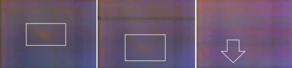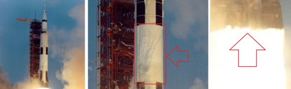 Если во второй и третьей ступени находились баки с жидким водородом, с еще более низкими температурами, то вторая и третья ступень должны были обледенеть еще больше, чем первая ступень. Но этого не произошло. 2 и 3 ступень ракеты «Сатурн-5» во всех полетах программы «Аполлон» были свободны от обледенения. Первая ступень этой ракеты была покрыта слоем льда в нижней своей части, где находились, на самом деле, баки с жидким кислородом. Такое явление могло произойти только в том случае, если во 2 и 3 ступени не было никаких баков с жидким водородом и с жидким кислородом. Обращает на себя внимание изображение темной завесы ниже сопла ЖРД первой ступени. По версии НАСА это было обычное явление для работы ЖРД F-1, следствие охлаждения керосином в трубчатой системе охлаждения камеры сгорания и сопла американского двигателя. На кадрах кинохроники такой завесы не наблюдается из-за плохого качества кадров. Есть вероятность, что появлением этой завесы зрители обязаны художнику НАСА. Если вместо ЖРД F-1 американцы использовали более надежные ЖРД Н-1, то в этом случае необходимо было добавить темную завесу. В шоу «Аполлон-13» из-за плохой видимости хороших кадров вспышек на первых минутах полета американцы не показали. На третьем кадре справа фиксируется покраснение кадра из фильма НАСА «Launch of Apollo 13». [2] Видимо это и был, тот самый врыв, серия вспышек в районе 2 и 3 ступени ракеты «Сатурн-5». Он отмечен на кадрах белым прямоугольником.