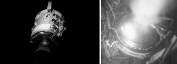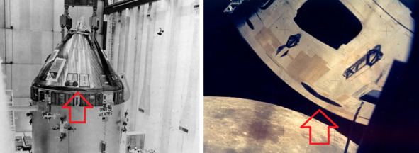 Создатели сайта НАСА показали внешний вид Командного модуля в американском космосе. Фотография НАСА 69-H-1792 слева показывает зеркальную поверхность КМ «Аполлон-13». Фотография НАСА 61—8727, справа, показывает, что поверхность КМ «А-13» стала бежевой, и не зеркальной.