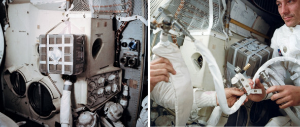 Спасение «космонавтов» состояло в использовании канистр с гидроксидом лития. Фотография НАСА с подписью: «AS13-62-8929 (11—17 апреля 1970 г.) Внутренний вид Лунного модуля Аполлон-13 (ЛМ), показывающий «почтовый ящик», устройство, созданное астронавтами «Аполлон-13» для использования командного модуля. Канистры с гидроксидом лития для очистки углекислого газа из «ЛМ». Гидроксид лития используется для удаления CO2 из атмосферы космического корабля. Поскольку в «ЛМ» было ограниченное количество гидроксида лития, это устройство было смонтировано для использования канистр из «CM». «Почтовый ящик» был спроектирован и испытан на земле в Центре пилотируемых космических кораблей прежде, чем он был предложен членам экипажа «Аполлона-13». Из-за взрыва одного из кислородных баллонов в Сервисном модуле (SM) трое членов экипажа должны были использовать «ЛМ» в качестве «спасательной шлюпки». [15] На другой фотографии НАСА as13-62-9004 американские «космонавты», которые находятся на грани гибели, не забывают сфотографироваться на память. Лицо «космонавта» не выражает обеспокоенности смертельно опасной ситуацией. На снимке НАСА «космонавт» демонстрирует бодрость и оптимизм. Он благодушно улыбается блаженной улыбкой. «Космонавты» не переживали по поводу возможной гибели.