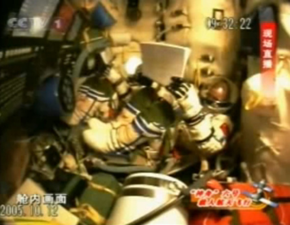 Версия КНР о втором полете в космос: «Шэньчжоу-6 – второй пилотируемый космический корабль КНР. Первый пилотируемый полёт КНР был осуществлен на корабле Шэньчжоу-5 в 2003 (космонавт Ян Ливэй). Основной экипаж: Фэй Цзюньлун – командир; Не Хайшэн – пилот. Это первый космический полёт для обоих космонавтов, но ранее они заслужили себе репутацию одних из лучших лётчиков-испытателей КНР. Их имена были объявлены за 5 часов до старта. В 1:21 UTC, через 21 минуту после запуска стартовых двигателей ракеты-носителя «Чанчжэн-2F», корабль был выведен на эллиптическую околоземную орбиту. Первая ступень ракеты упала в районе Внутренняя Монголия и была обнаружена через 45 минут после старта. В 7:55 UTC был выполнен первый орбитальный манёвр и корабль перешёл на круговую орбиту с апогеем 336 км. В 9:30 UTC Фэй Цзюньлун перешёл в орбитальный модуль корабля. Не Хайшен остался в спускаемой капсуле аппарата.