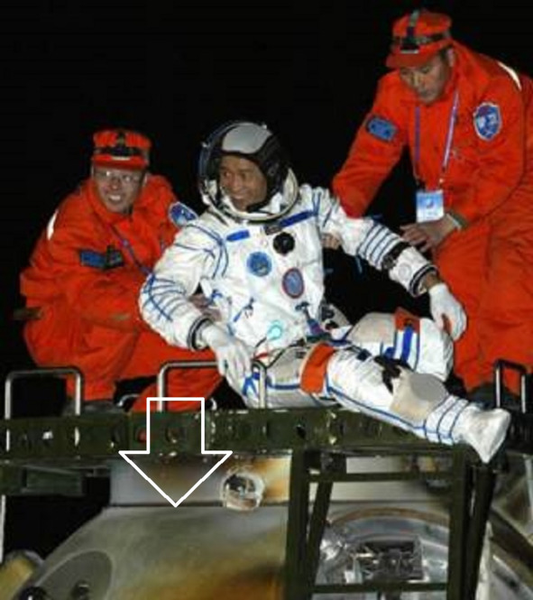 Но на этом аномалии китайских «товарищей» не закончились. После приземления просматриваются аномальные явления на поверхности «космической» капсулы с тайконавтами. Проблема очень серьезная и ее невозможно игнорировать. После приземления китайские «товарищи» показали несколько моментов этого эпизода, которые им не следовало показывать. Фотографии и телевизионная съемка делалась ночью, но кое-что удалось разглядеть. Стрелкой показан участок капсулы, где отсутствует копоть и нагар. На фотографии выше. На другом кадре ситуация еще хуже: Боковая сторона аппарата блестит. Она хорошо демонстрирует отсутствие копоти и нагара.