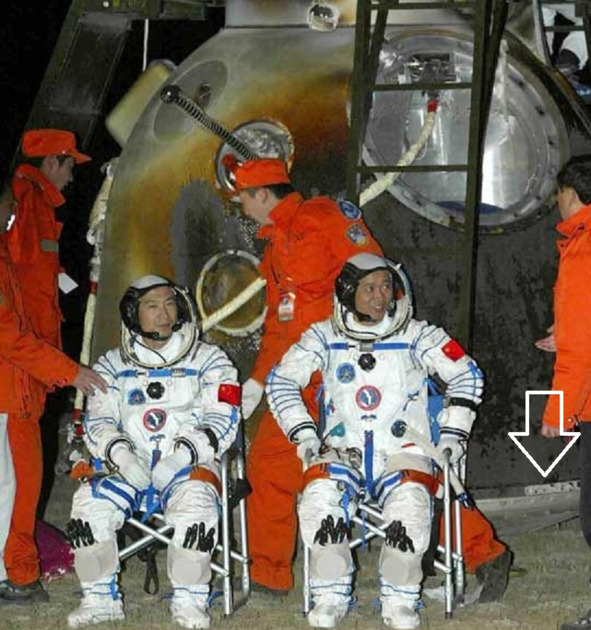 На фотографии, выше, опубликованной китайским информационным агентством «Синьхуа», китайские астронавты Фэй Цзюньлун (слева) и Не Хайшэн сидят рядом с посадочной капсулой второго пилотируемого космического корабля Китая «Шэньчжоу-6» после приземления в уезде Сизиван, автономный район Внутренняя Монголия Северного Китая, в понедельник, 17 октября 2005 года. (Фото: AP Photo/Xinhua, Zhao Jianwei.) Если бы стороны аппарата поверглись бы настоящему аэродинамическому нагреву, то подобной отметины в этом месте не было бы. И доказательством этого могут служить следующие снимки китайских спутников. Капсула черная от копоти.